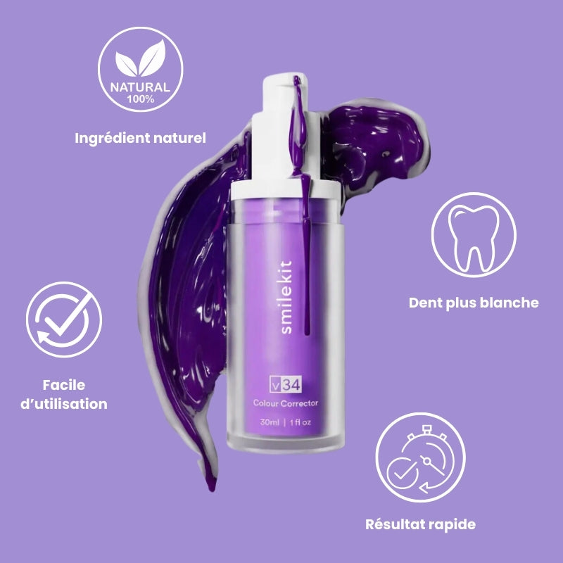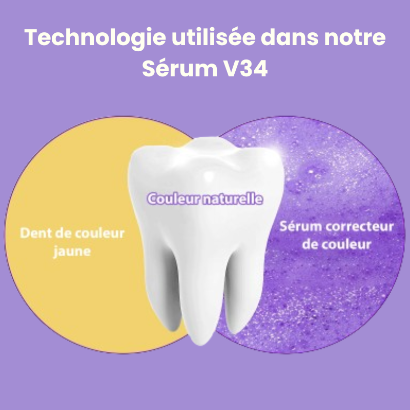 La couleur violet de notre sérum va venir se poser sur l'email de vos dents. La couleur jaune des dents va ainsi s'estomper en devenant Blanc.